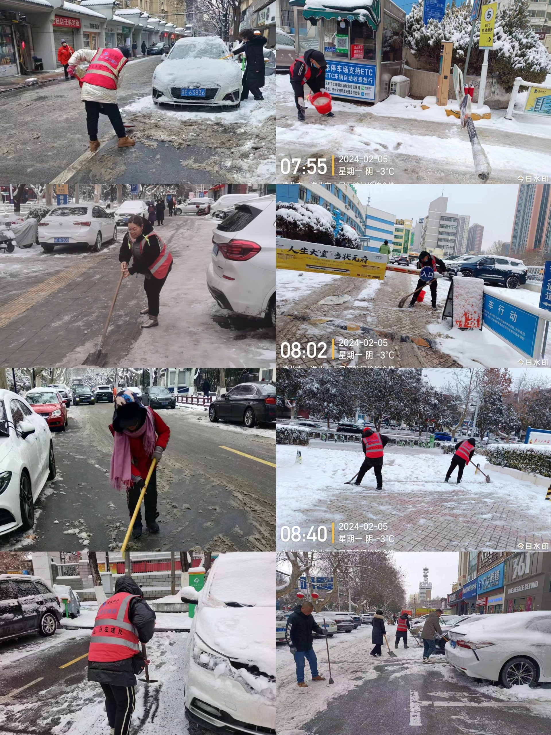 工作人員帶著鐵鍬雪鏟,充分發(fā)揮黨員模范帶頭作用,不畏嚴(yán)寒、沖鋒在前,積極參與除雪融冰、道路清潔。每個(gè)人分區(qū)清掃停車場出入口和路面人行道上的積雪,針對已經(jīng)結(jié)冰的路面,工作人員使用除冰劑進(jìn)行清除。大家齊心協(xié)力,為停車場及路面車道車輛出入開辟了一條安全暢通路。