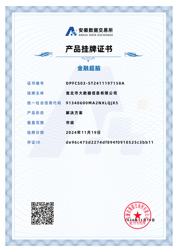 自2024年9月20日安徽省數(shù)據(jù)交易所揭牌成立以來,淮北市大數(shù)據(jù)信息有限公司積極和省數(shù)交所對(duì)接,分析調(diào)研數(shù)據(jù)要素流通市場,交流探討數(shù)商合作生態(tài),研究探索數(shù)字產(chǎn)品掛牌交易。近期,我司金融信貸服務(wù)解決方案方向的數(shù)據(jù)產(chǎn)品“金融超腦”在交易所成功掛牌,實(shí)現(xiàn)了公司乃至淮北市數(shù)據(jù)產(chǎn)品在省數(shù)據(jù)交易所零的突破。為推進(jìn)我市數(shù)據(jù)要素市場化改革、助力經(jīng)濟(jì)社會(huì)高質(zhì)量發(fā)展、發(fā)揮數(shù)據(jù)乘數(shù)效應(yīng)增磚添瓦。